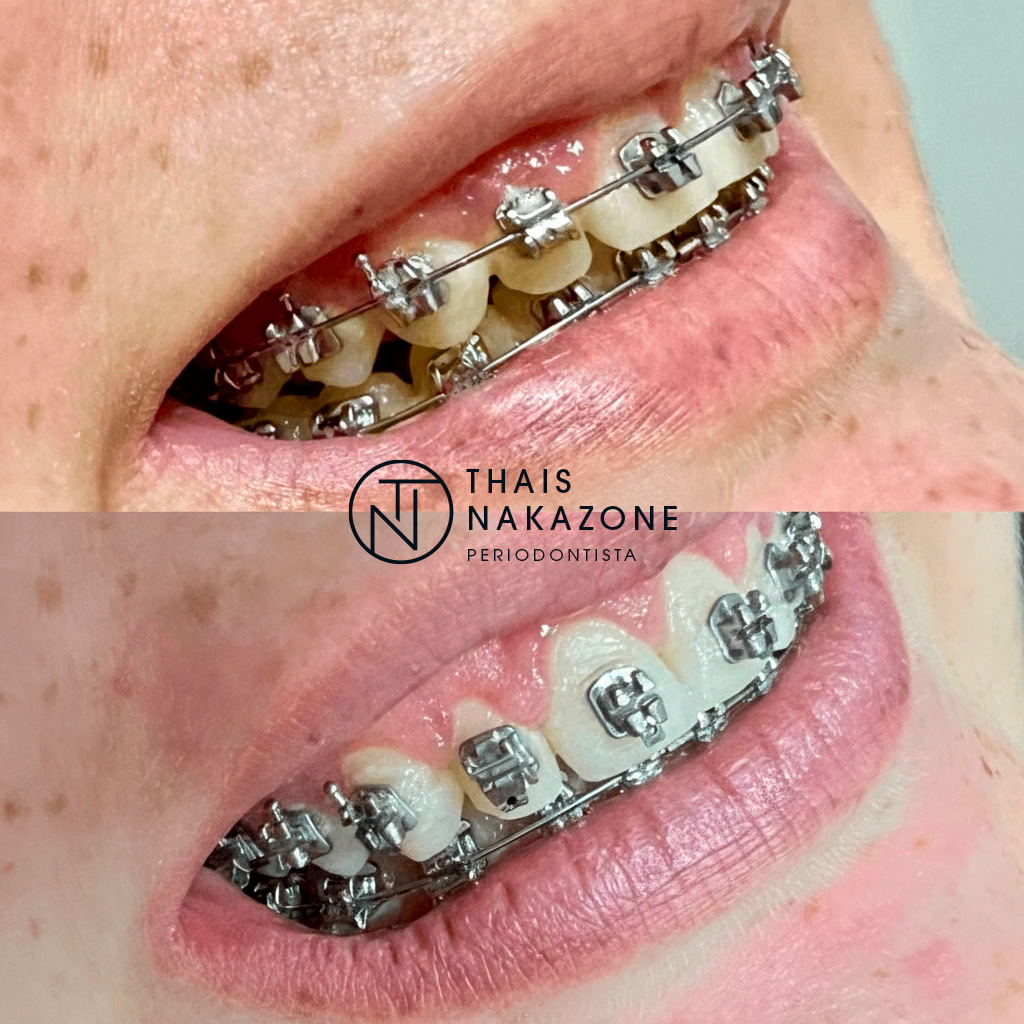 Se a gengivoplastia for indicada para melhorar a higiene, por conta do acúmulo de gengiva ao redor dos dentes durante o uso do aparelho, ela pode sim ser realizada ainda durante o tratamento ortodôntico. Isso facilita a escovação e ajuda a prevenir inflamações, cáries e gengivite.